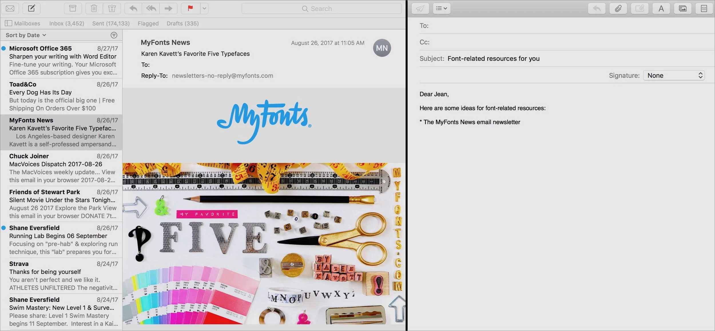 More obvious is how Mail revamped its behavior in full-screen view. Instead of the message-composition area overlapping most of the Mail window, the screen splits, and your new message appears at the right. This layout simplifies viewing an older message while drafting a new one.