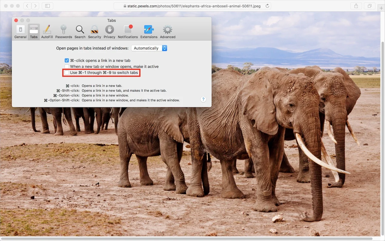 /In 2015, Apple quietly changed the behavior of the Command-1 through Command-9 keys in Safari on the Mac. Before then, pressing Command-1 would open the first bookmark on your Favorites bar. Now, however, Command-1 switches to the first tab, Command-2 opens the second tab, and so on. If that’s not how you want to work, choose Safari > Preferences > Tabs and deselect “Use ⌘-1 through ⌘-9 to switch tabs.” From then on, Command-1 through Command-9 will once again open bookmarks. Regardless of which behavior you prefer, you can reverse it on any invocation with the Option key, so if you set Command-1 to open your first bookmark, Command-Option-1 switches to the first tab.