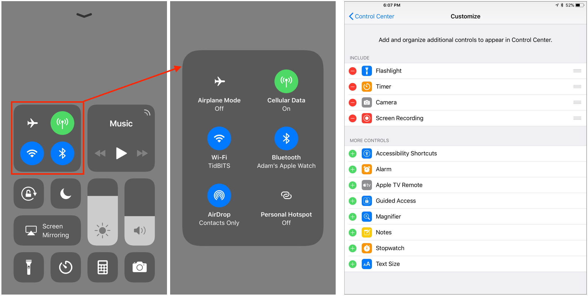Apple redesigned Control Center, which most people still get to by swiping up from the bottom of the screen (iPad users keep swiping up after the Dock appears, and iPhone X users will have to swipe down from the right-hand top of the screen). It’s back to a single page of icons, and you can access additional options by pressing and holding on any set of controls. Even better, you can add (and remove) controls in Settings > Control Center > Customize Controls.