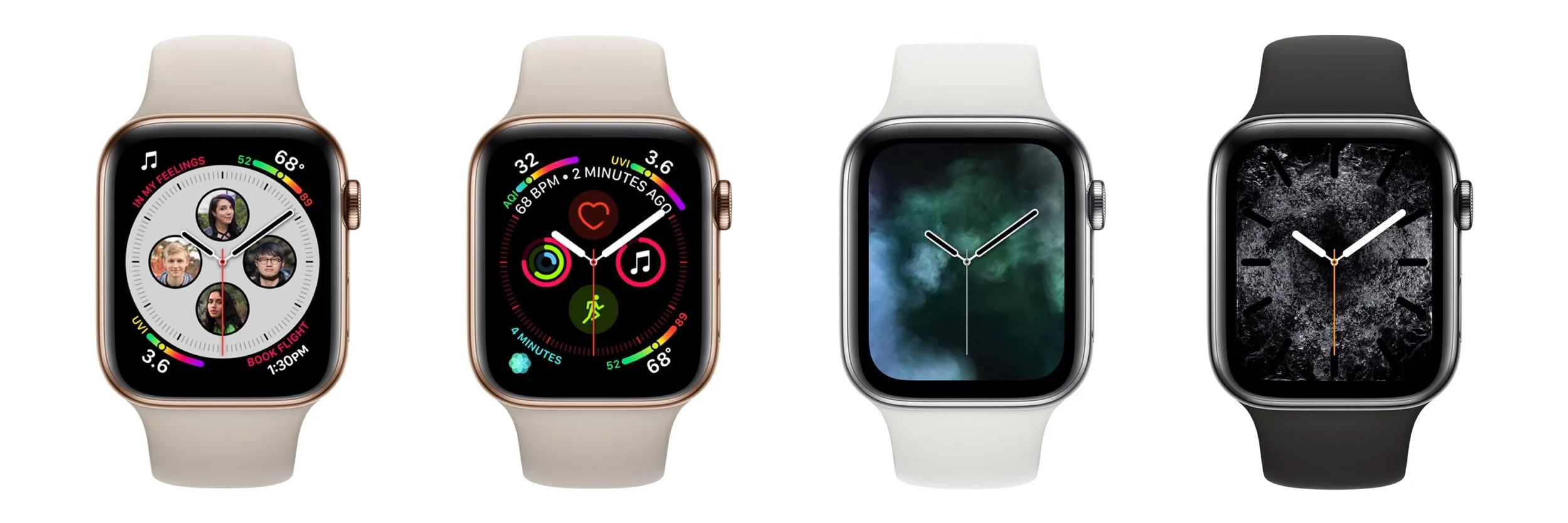 To use the extra screen space effectively and show off the power of its new S4 chip, the Series 4 comes with some new faces. The Infograph face can incorporate up to eight complications, the Breathe face moves in time with a deep breath, and Vapor, Fire, Water, and Liquid Metal faces animate behind virtual clock hands.