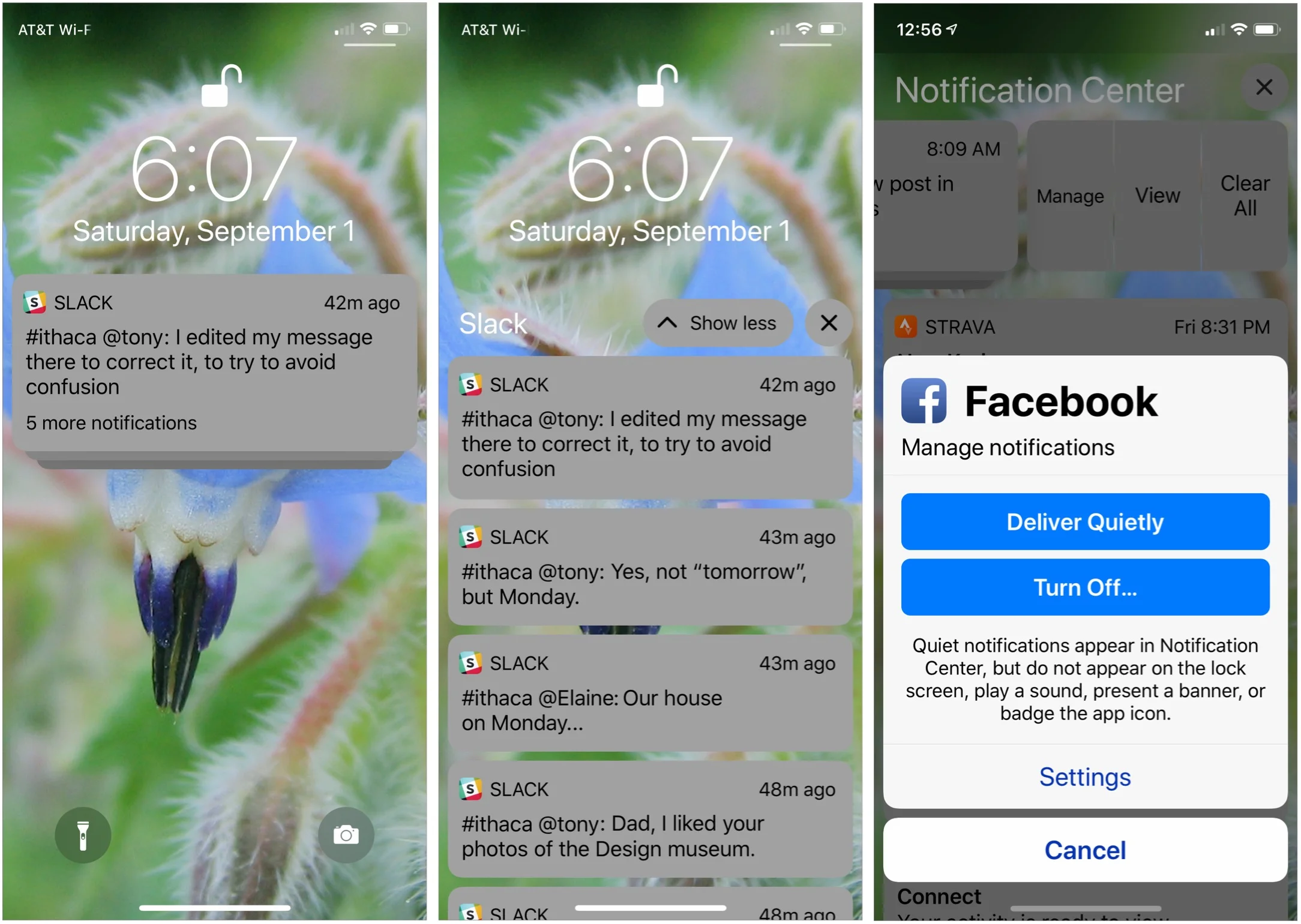 It’s easy to become overwhelmed with notifications, especially if you have chatty friends in messaging apps. iOS 12 can reduce the impact of non-stop notifications. On the Lock screen, iOS 12 now groups message threads and multiple notifications from the same app. Tapping a group expands it so you can see the details.