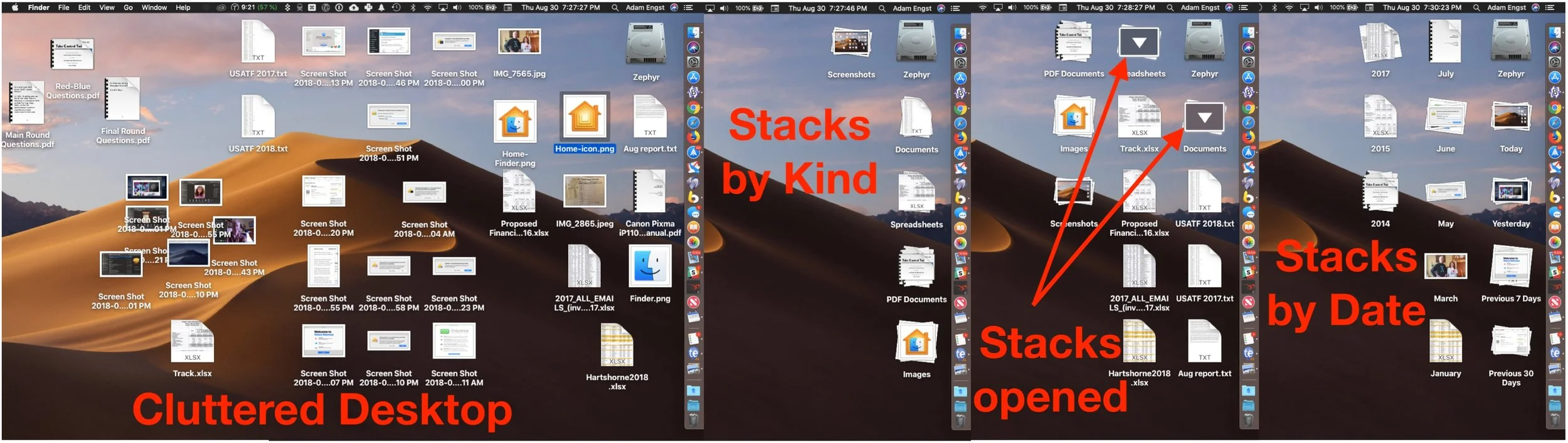 Turning to more practical changes, Mojave’s Finder boasts a few new features to help you better navigate a cluttered Desktop and overflowing folders. Control-click the Desktop and choose Use Stacks, and the Finder will combine all the related icons on your Desktop intostacks. It collects them by kind by default, but you can instead have it group them by various dates or even by tags. Click a stack to see what’s inside.