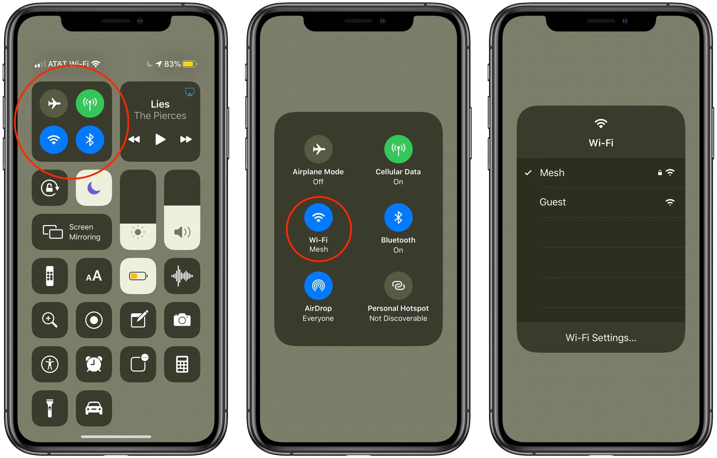 What happens when you press and hold is more predictable. If you press and hold a button that has more options (or if you press and hold a “card,” which is what Apple calls the collection of buttons for networking and audio controls), another screen opens, showing controls for those settings. Some of those screens provide even more options—press and hold the networking card to expand it from four buttons to six, and then press and hold the Wi-Fi, AirDrop, or Bluetooth button to switch Wi-Fi networks, choose who can send you files via AirDrop, or connect to Bluetooth devices.