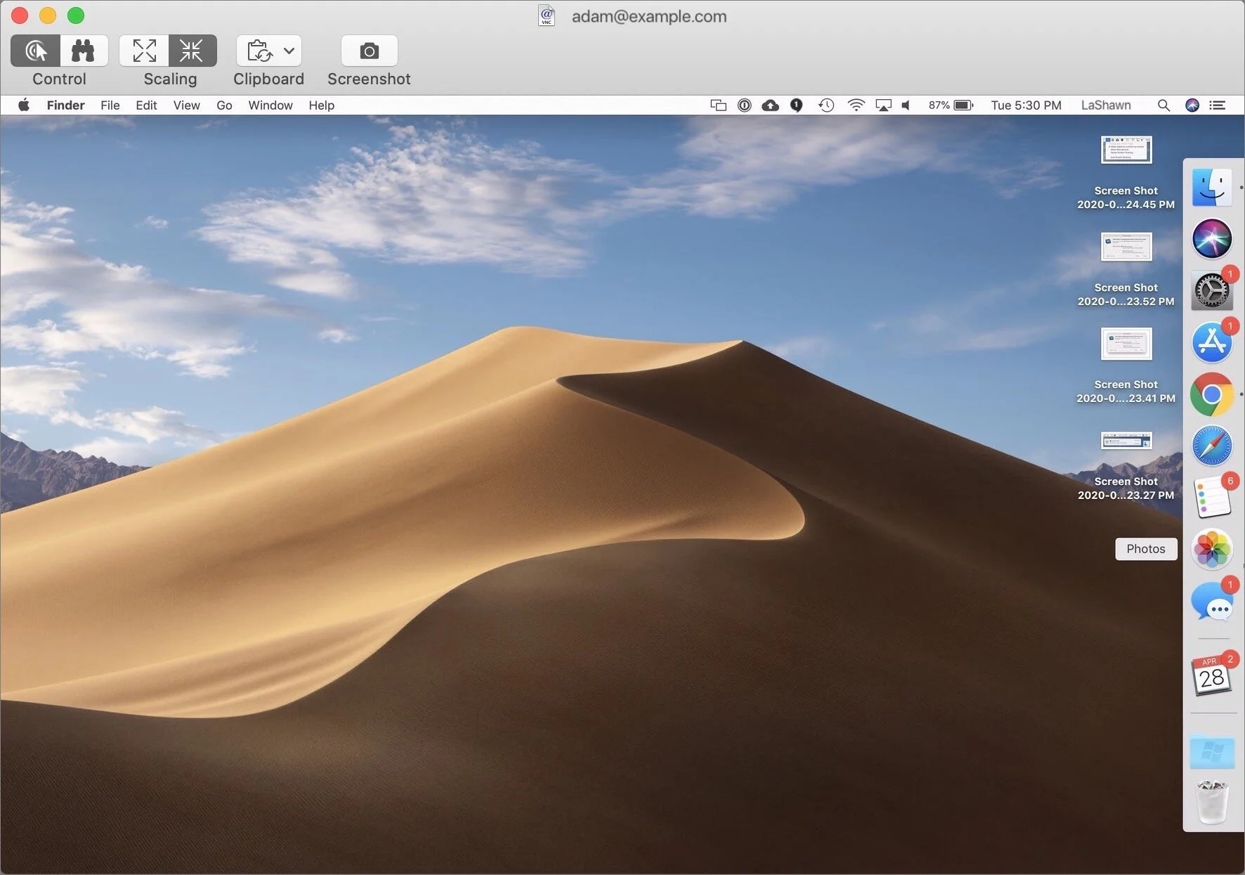 Take a screenshot: Normal screenshot controls don’t work for taking a screenshot of the remote screen, or rather, they’ll work on the remote Mac. To take a screenshot of what you see and keep it on your Mac, click the Screenshot button.