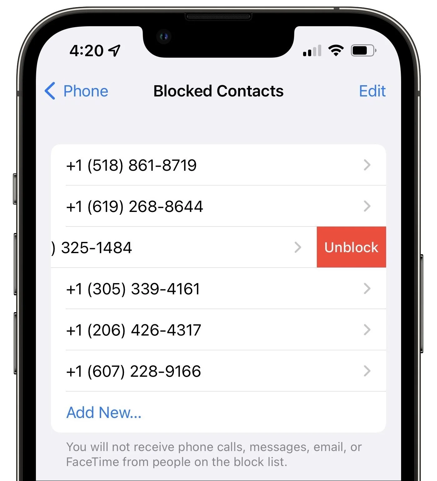 5) Unblock the contact: In theory, you should still be able to place calls to blocked numbers, but incoming calls from blocked numbers will be sent directly to voicemail. Look for blocked contacts in Settings > Phone > Blocked Contacts and swipe left on a contact to unblock it.