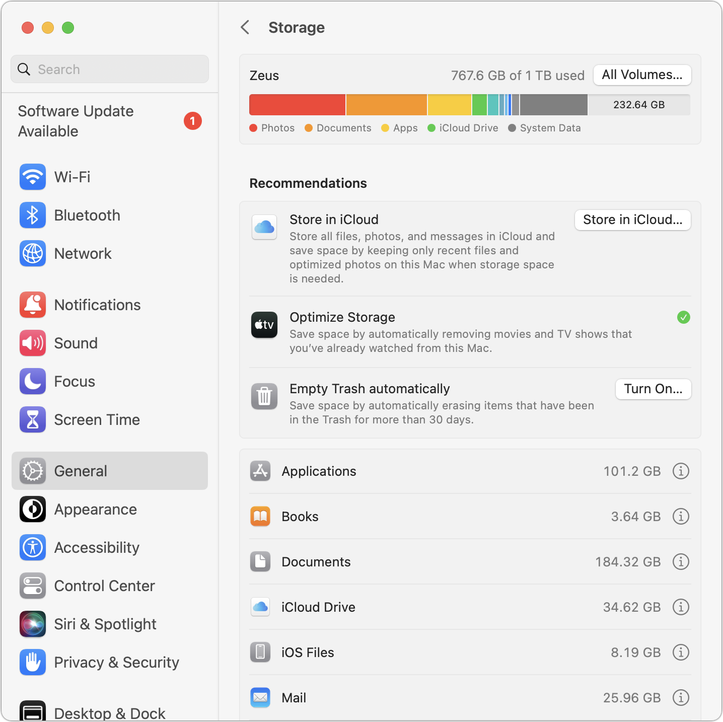 Clear space: Sonoma may need as much as 25 GB of free space to upgrade, and the Sonoma installer itself is about 12 GB, so we recommend making sure you have at least 37 GB free. Don’t cut this close—you should always have at least 10–20% free space for virtual memory, cache files, and breathing room. Check in Ventura by choosing System Settings > General > Storage; in earlier versions of macOS, choose About This Mac from the Apple menu and click Storage. System Settings provides quick ways to free up space. Another easy one for iCloud Drive users is to Control-click large folders and choose Remove Download to “evict” the local versions of those files temporarily; Box, Drop-box, and Google Drive have similar features.