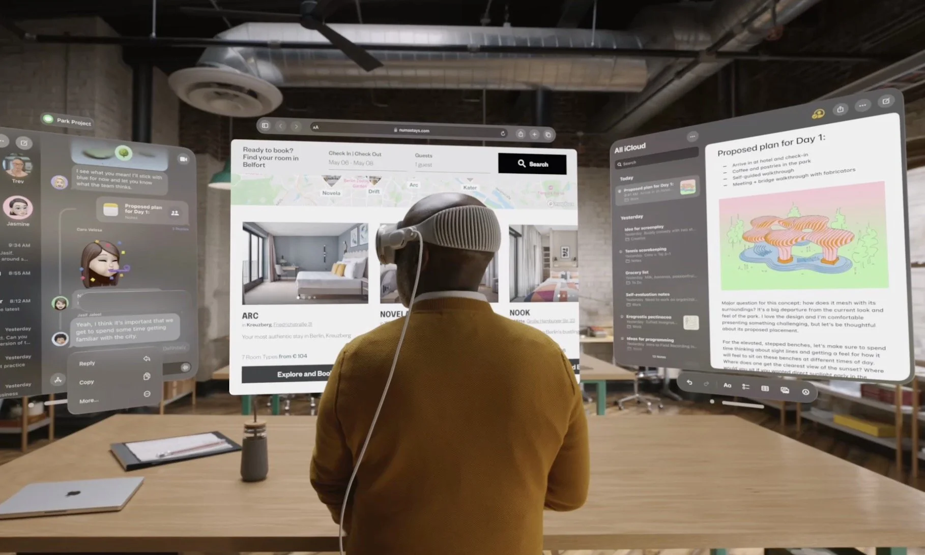 The Vision Pro blends digital content with the physical world, providing a three-dimensional interface controlled by the user’s eyes, hands, and voice. Users can display apps as floating windows or bring a Mac’s screen into Vision Pro as an enormous 4K display. Along with controls triggered by eye tracking and hand gestures, plus a virtual keyboard, users can use the Magic Trackpad and Magic Keyboard for faster interaction.
