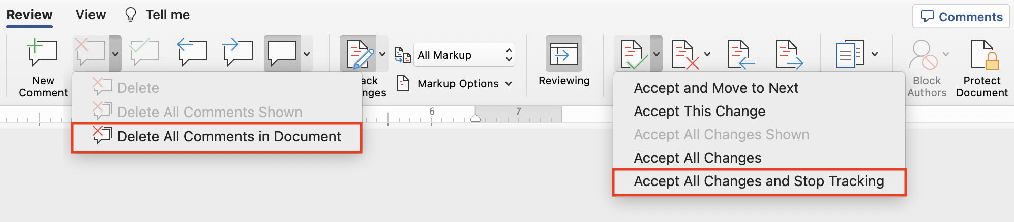 To remove change tracking and comments in Word, click Review in the toolbar. Next, click the arrow next to the Delete button in the comments section and choose Delete All Comments in Document. Finally, click the arrow next to Accept in the change tracking section and choose Accept All Changes and Stop Tracking. Browse through the document to make sure accepting all changes didn’t do something unexpected, and then save.
