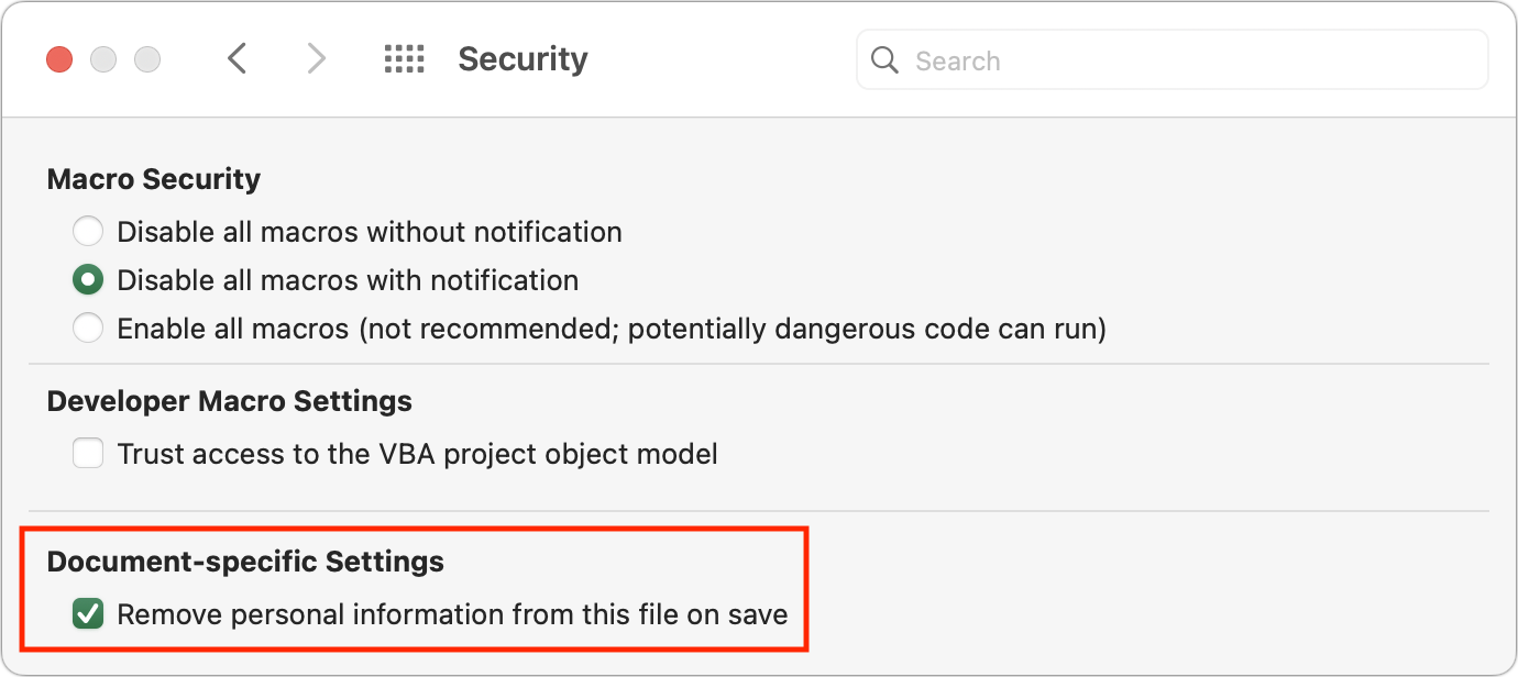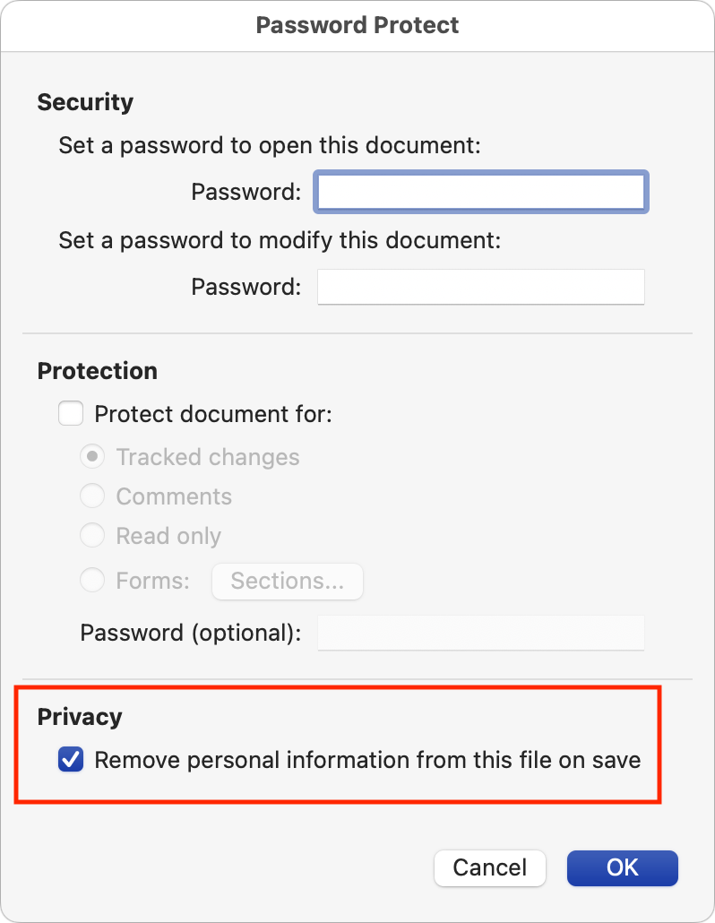The three Office apps offer different approaches to removing personal information in the Summary and Custom tabs, and the process is extremely different than in the Windows versions. (For Windows, refer to Microsoft’s instructions.) Here’s how you remove personal information: