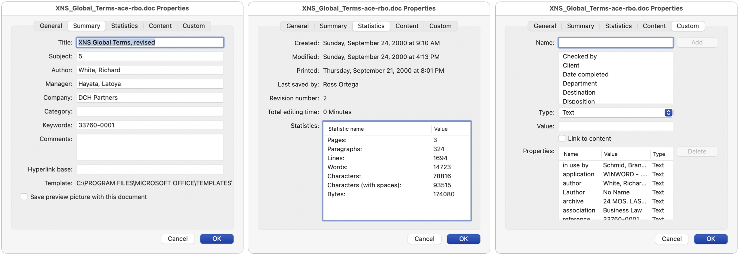 To see what metadata is in the document properties of a Word, Excel, or PowerPoint document, choose File > Properties, and look in the Summary, Statistics, and Custom tabs. Generally speaking, these won’t contain anything damning, but they may reveal information like the names of people associated with the document. Don’t assume there’s no metadata here just because you didn’t add anything manually—document control systems can add metadata you don’t expect.