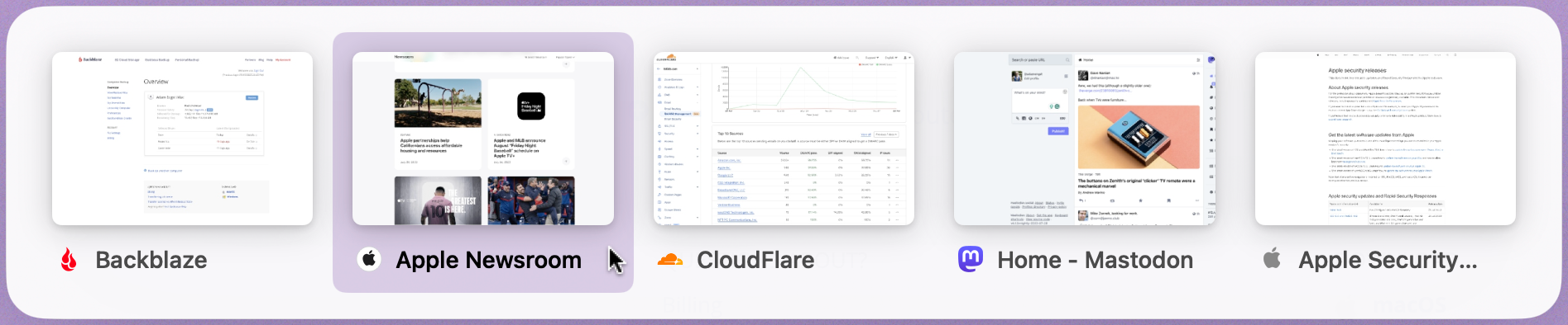 Another particularly useful keyboard shortcut is Control-Tab. Press it to switch back and forth between your two most recent tabs, or pause briefly to display a graphical switcher with the five most recent tabs—it works just like the Mac’s Command-Tab app switcher.