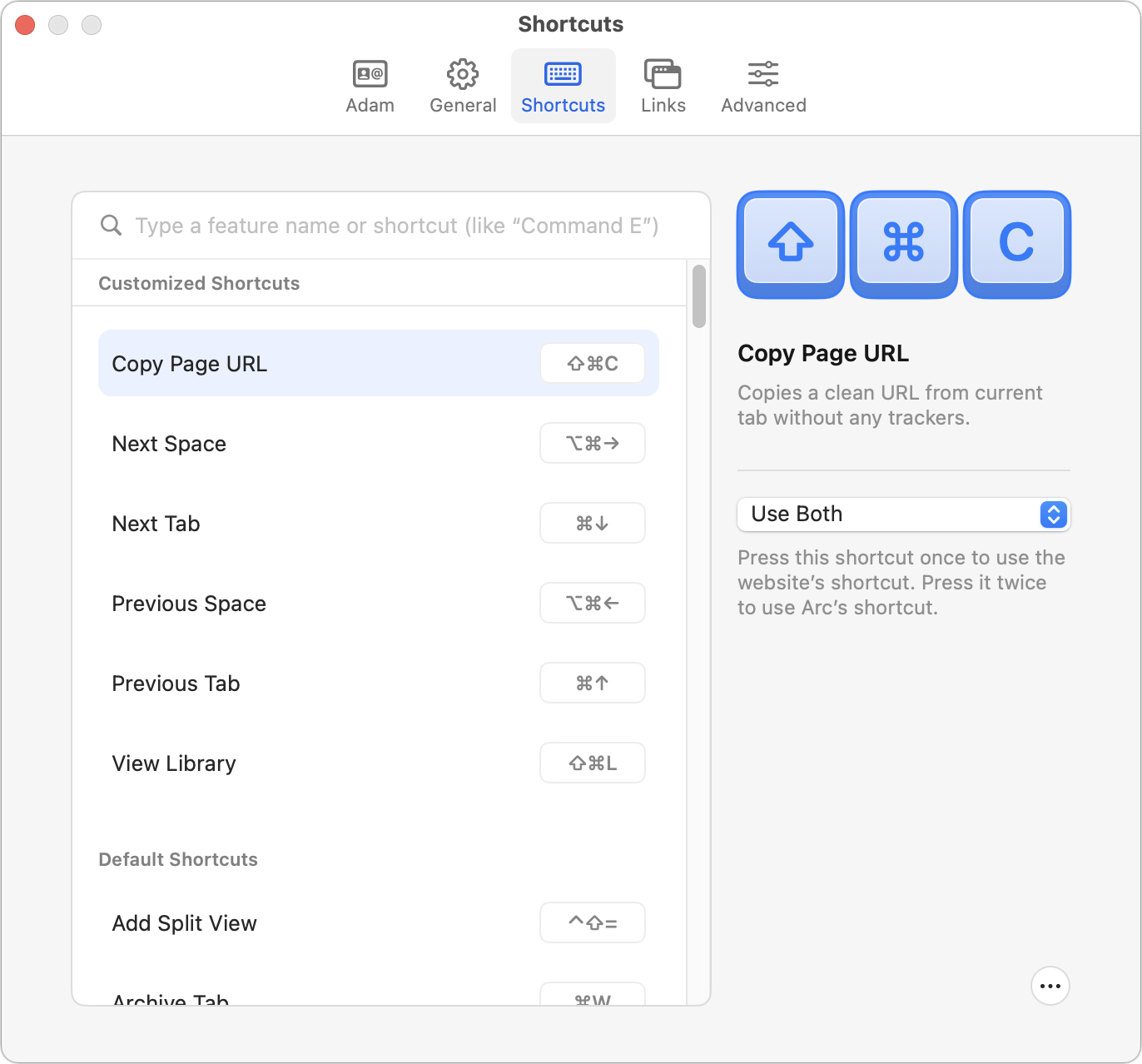 If Arc’s default keystrokes don’t work for you, you can customize them to be more memorable, with settings that control whether Arc or a website gets preference for conflicting shortcuts.