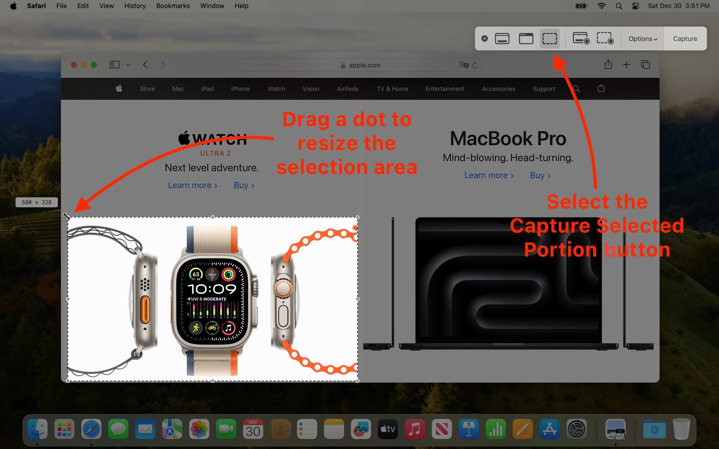 Capture Selected Portion: To take a screenshot of an arbitrary portion of the screen, use the third screenshot button. Click it and then resize and reposition the selection rectangle over the desired area—note that it shows you the pixel dimensions of the selection. (Reposition the rectangle by moving it with the hand pointer that appears when you hover over it, and resize it by dragging any selection dot.) Finally, click the Capture button at the right of the control bar or press the Return key to create the screenshot.