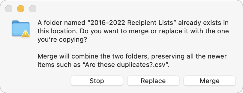 /You’ve ended up with two folders whose contents—hundreds of files or more—are similar but not identical. Perhaps you’re recovering from a sync failure, or maybe you pulled an old version of the folder from a backup and aren’t sure what’s different. Regardless, here’s how you can merge them in the Finder. Make sure the folders are named identically and are in two different locations on your Mac. Press and hold the Option key, then drag the folder that contains more files to the location that contains the folder with fewer files. In the dialog that appears, click Merge to copy only newer files from the source and those not already in the destination. (It’s not a two-way sync; for that, you need an app like ChronoSync.) The Merge button appears only if the source folder contains files not in the destination; if the folders contain just different versions of identically named files, you’ll get only Stop and Replace buttons. For safety, always work on copies of your folders and check your work afterward to ensure the right things happened.