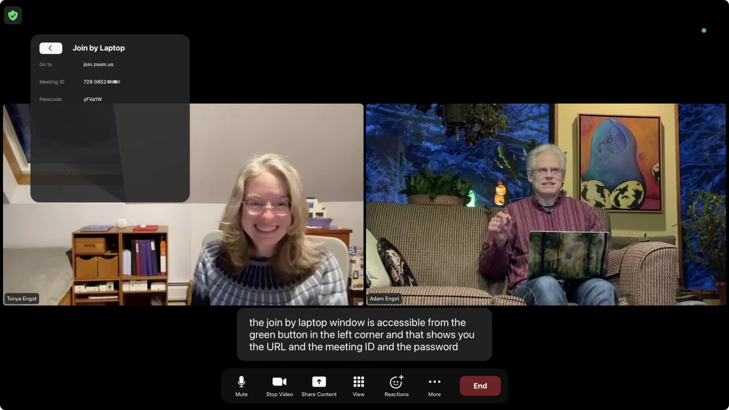 The remaining option is to swipe up on the clickpad during a meeting to select the green shield button in the upper-left corner. That displays the meeting details, and a Join by Laptop button (the second screenshot below) shows the necessary URL, meeting ID, and passcode to share in another channel, like Messages or the phone. There’s no other way to share a link to a meeting that we could find.
