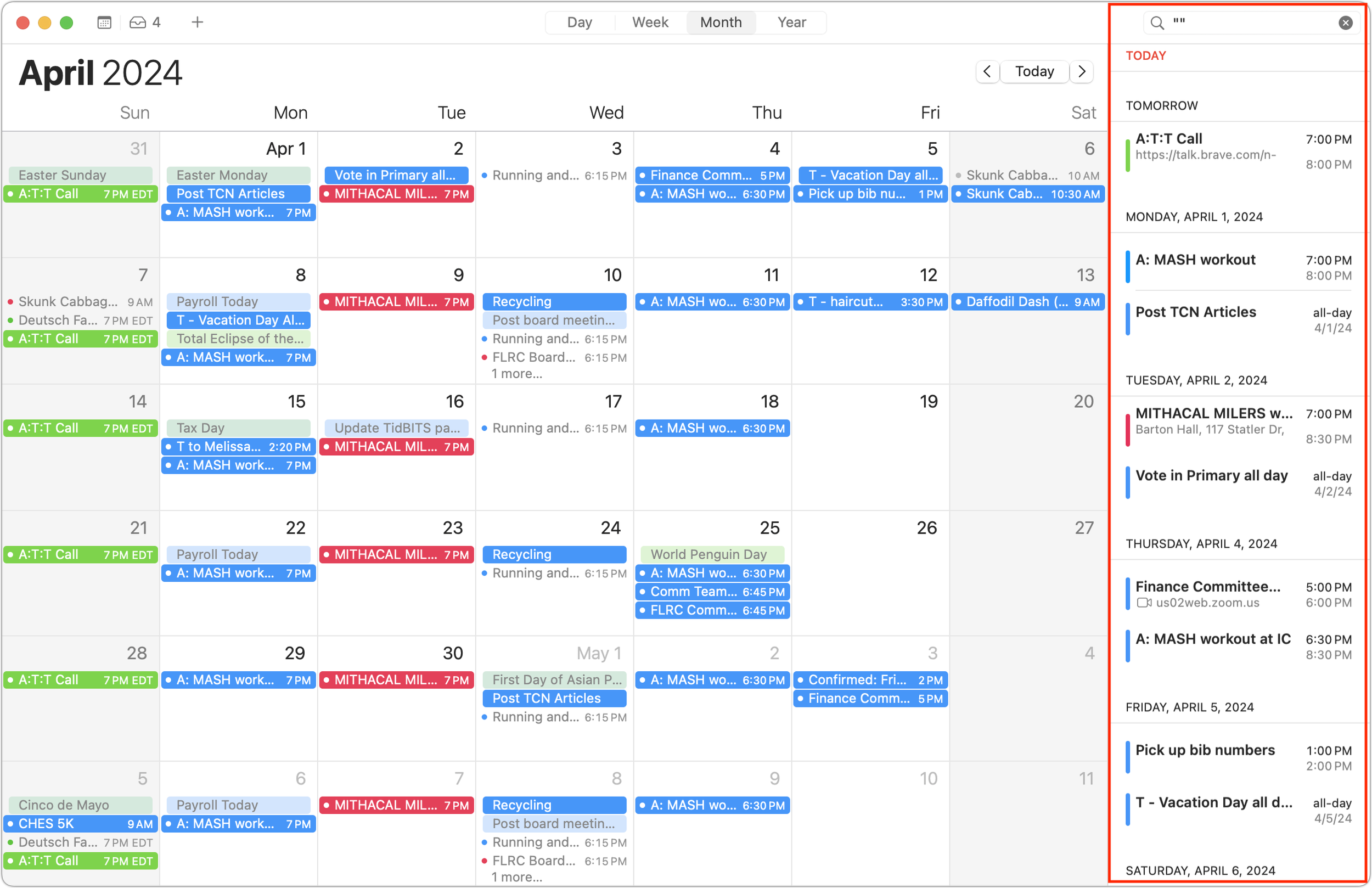 /Along with day, week, month, and year views, most calendar apps offer the option of a simple chronological list of events, which can be a handy way to see what’s coming up. Apple’s Calendar app on the Mac is unfortunately not among those apps. However, there is a trick you can use to get it to show all your upcoming events in a scrolling list. Click in the Search field in the upper-right corner and enter two double quote marks (""). In essence, it’s a search for “everything,” and Calendar promptly shows all your events in a row down the right side of the window. If you’re looking for a more capable calendar app, BusyCal and Fantastical are popular in the Mac community, and some apps like Microsoft Outlook and Zoom also include calendaring features.