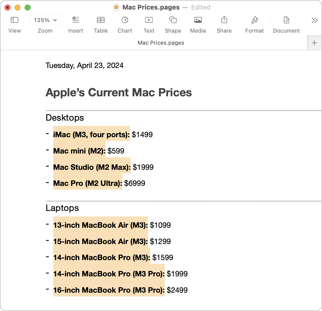 /The latest versions of the Mac and iPad apps in Apple’s iWork suite—Pages 14, Keynote 14, and Numbers 14—have gained a helpful feature: non-contiguous text selection. By holding down the Command key, you can select chunks of text that aren’t next to each other. For example, imagine you want to make the first part of each item in a bullet list bold. Instead of bolding each one separately, hold down Command as you work to select all of them and then apply bold to the entire selection with a single command. Non-contiguous selection is particularly helpful when applying formatting, but you can also copy non-contiguously selected text or work with it in nearly any way you would interact with a contiguous text selection. (Note that while holding down Command, you can double-click to select words or triple-click to select paragraphs, just as you can normally without holding down Command.)