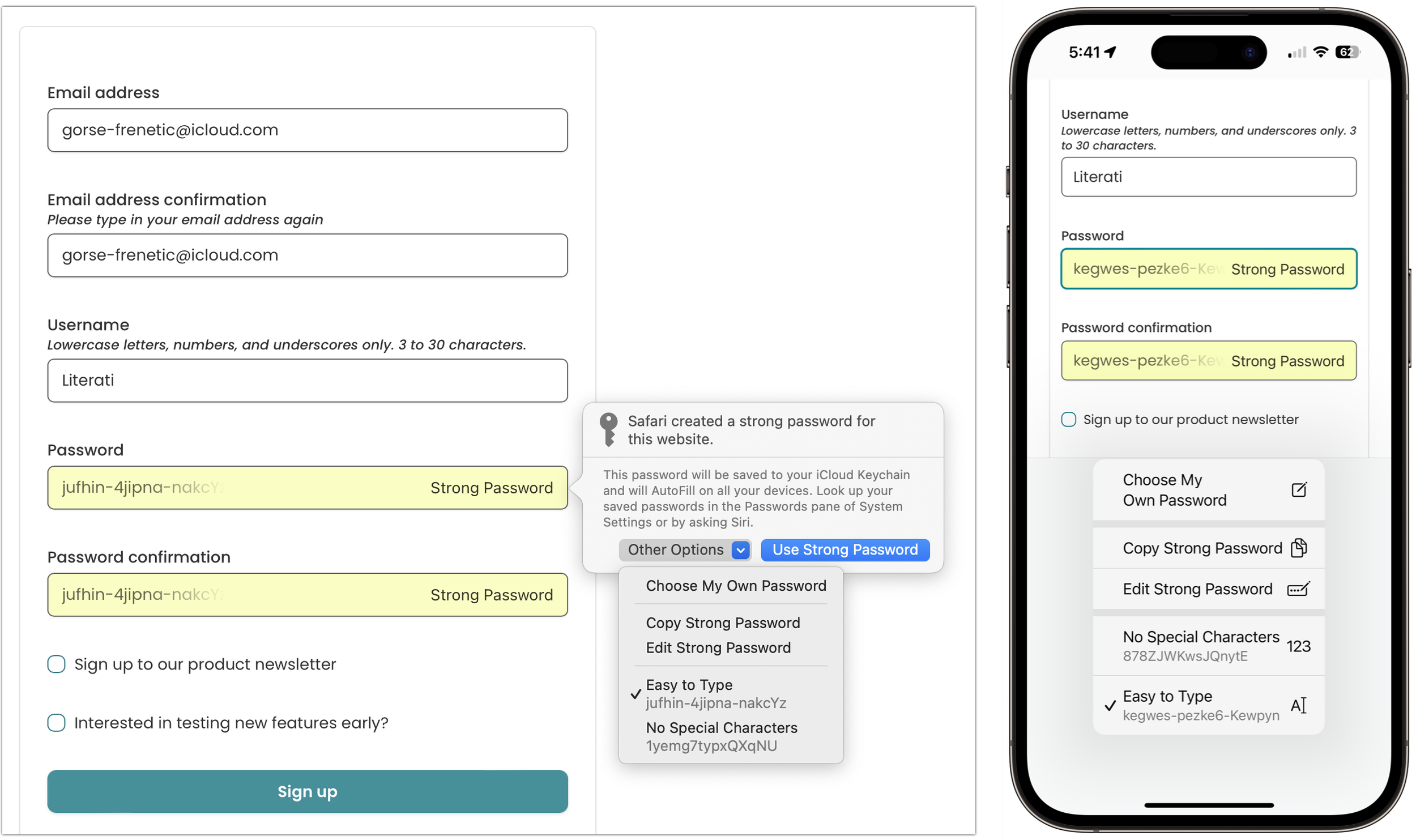 Create a new login: When you need to create an account on a new website, after you enter whatever it wants for email or username, Safari creates a strong password for you. Unfortunately, the iCloud Passwords extension or add-on on the Mac can’t generate passwords—you can either create a strong password manually or switch to Safari temporarily to let it create one. When you submit your credentials, you’ll be prompted to save them.