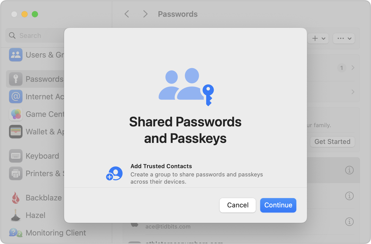 Shared groups let you share a subset of passwords with family or colleagues. Choosing New Shared Group triggers an assistant that walks you through naming the group, adding people from Contacts, and choosing which passwords to share. You can move passwords between groups at any time.