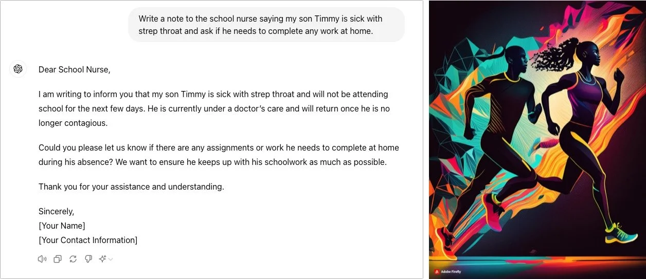 Despite Apple’s recent relabeling of features as using AI, when most people think about AI, they’re thinking of “generative AI” systems like OpenAI’s ChatGPT chatbot or Adobe’s Firefly artbot. These systems generate impressively good text and images from scratch based on user prompts. Ask ChatGPT to write an excuse for your sick kid, and you’ll get fluid, correct English. With Firefly, describe an image—“silhouettes of male and female runners with bright colors and black background”—and you’ll get images that match pretty well.