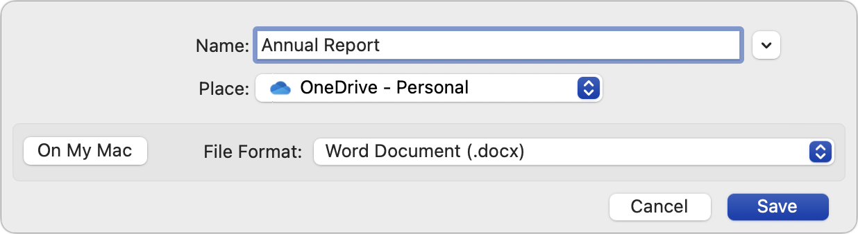 /By default, Microsoft Office apps—Word, Excel, and PowerPoint—try to save files on Microsoft OneDrive as a way of promoting the company’s cloud storage. If that’s undesirable, you can easily keep your files locally on your Mac or in a different cloud storage location. In the Save dialog, click the On My Mac button to switch to a standard Save dialog showing all your other storage options. There’s no way to set On My Mac as the default location, but the Save dialog automatically remembers your last saved location. That should be sufficient most of the time, although it’s not unheard of for an Office update to flip the Save dialog back to OneDrive.