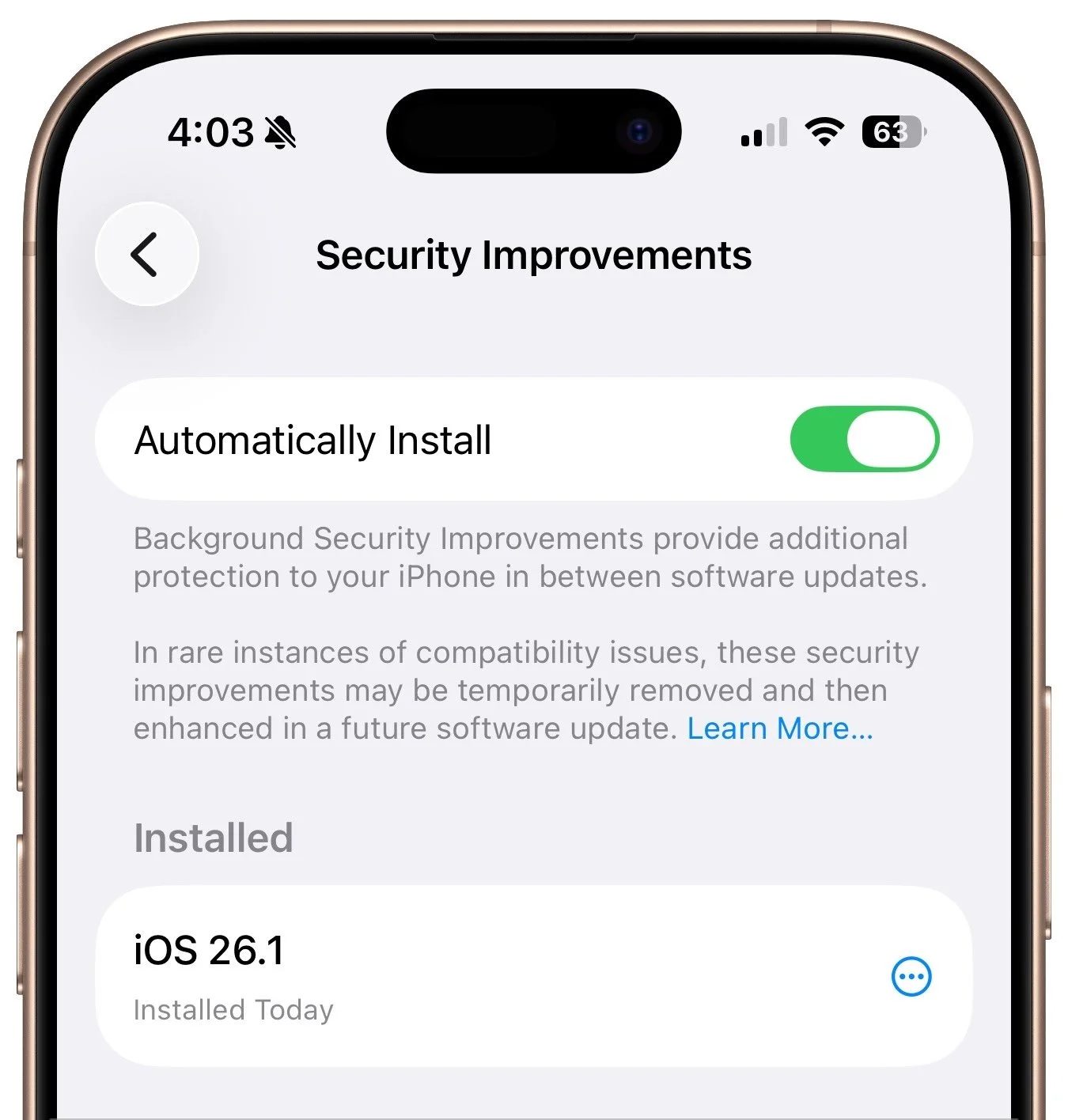 Several years ago, Apple introduced Rapid Security Responses, focused security updates that aimed to reduce update hesitancy with small downloads, automatic installation, and easy reversal. For unknown reasons, Apple used them only a couple of times before reverting to traditional operating system updates. Now, Rapid Security Responses seem to have returned under a new name: Background Security Improvements. They’re enabled by default in Settings > Privacy & Security > Background Security Improvements > Automatically Install. If you prefer to approve these updates in advance, you can turn that off. (A similar setting is available for macOS 26.1.)