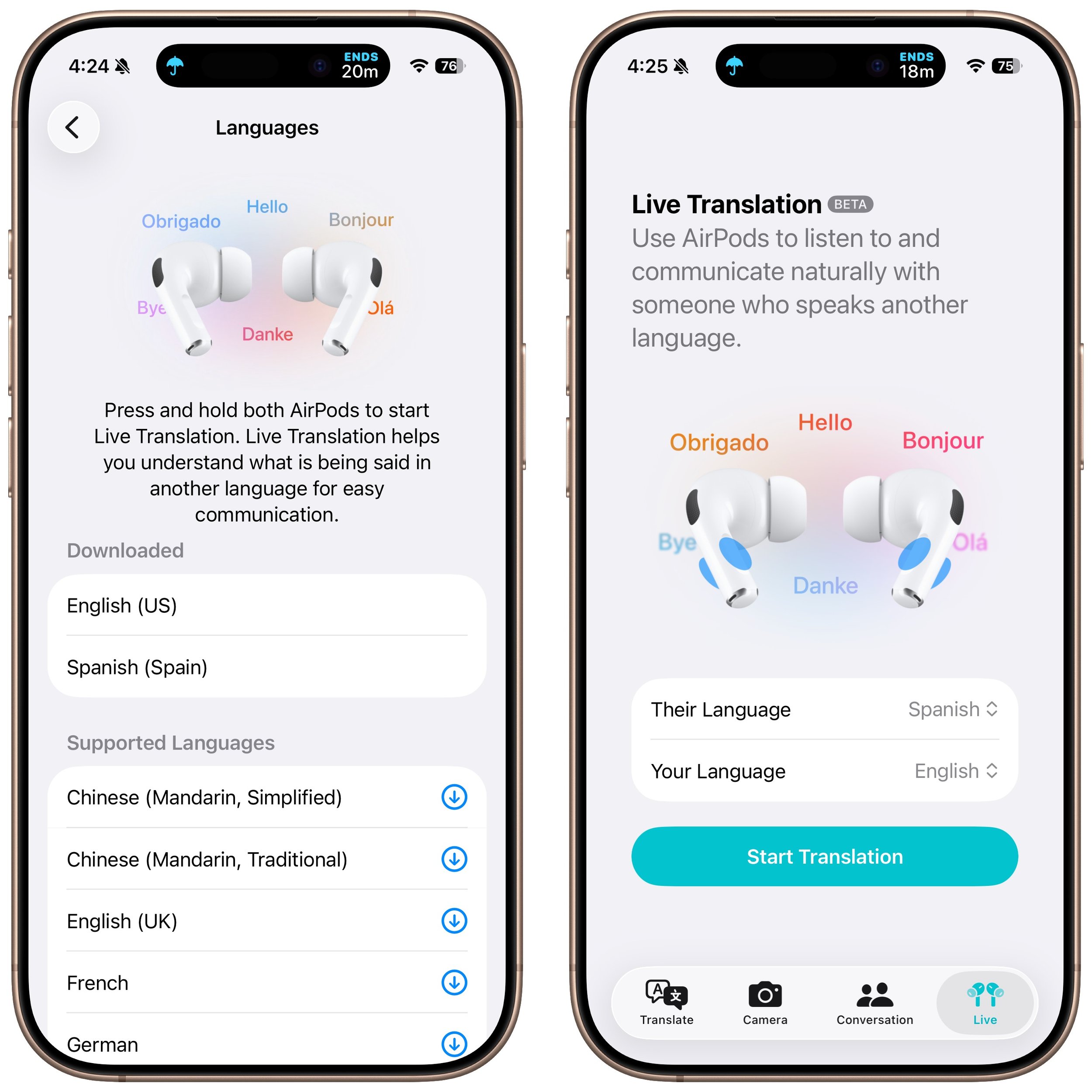 iOS 26 introduced Live Translation with the AirPods 4 with Active Noise Cancellation, AirPods Pro 2, and AirPods Pro 3. Initially, it supported English (US and UK), French, German, Portuguese (Brazil), and Spanish (Spain). In iOS 26.1, Apple added Chinese (Mandarin, simplified and traditional), Italian, Japanese, and Korean. To avoid delays in getting new languages when you are out and about, download the languages you expect to need ahead of time, when you have a fast Internet connection. Go to Settings > Bluetooth and tap the ⓘ next to your AirPods. Scroll to and tap Languages, then select the desired language. For actual use, open the Translate app, tap Live, and select the two languages you want to translate between.