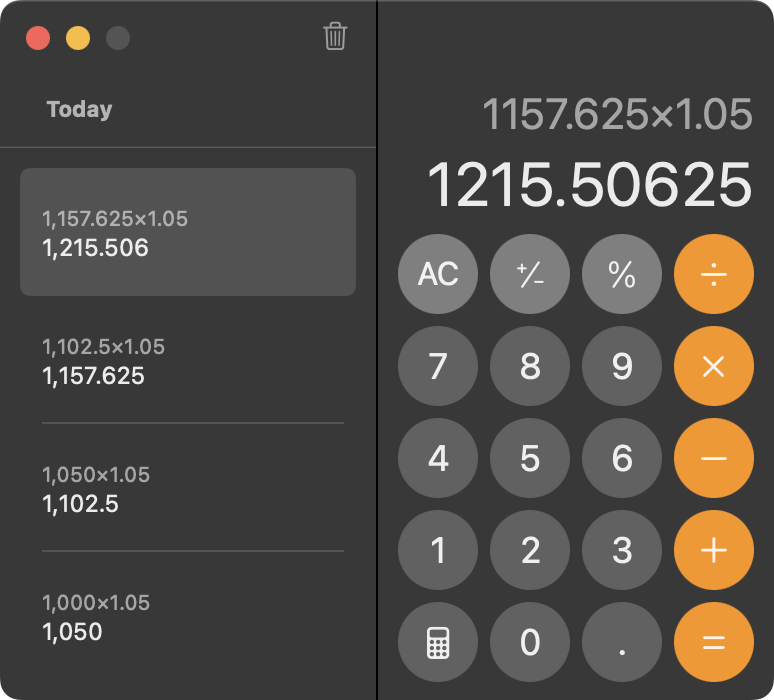 /In iOS 18, iPadOS 18, and macOS 15 Sequoia, Apple removed a standard feature of the Calculator app that allowed users to press the = button multiple times to repeat the last mathematical operation. Following user complaints, the company reinstated this feature in iOS 18.3, iPadOS 18.3, and macOS 15.3. Now, to calculate the compound interest from investing $1,000 at 5%, you can multiply 1000 by 1.05 and press = repeatedly to see how your investment would grow. (To open the history sidebar on the Mac, choose View > Show History; on the iPhone, tap the hamburger button in the upper-left corner.)